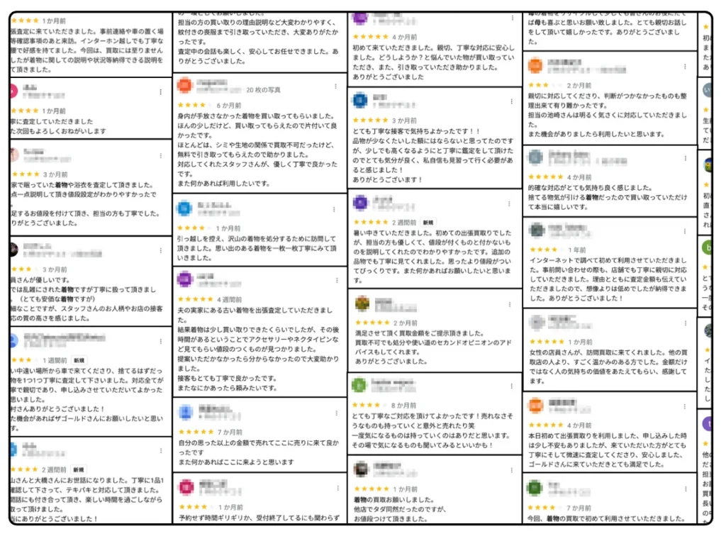 | 口コミ 分析 | 買取額に満足 92% 入金が早い 85% 対応が丁寧 91% | 買取額に満足 81% 入金が早い 78% 対応が丁寧 82% | 買取額に満足 78% 入金が早い 72% 対応が丁寧 76% |
