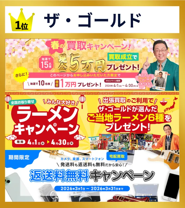 | 総合評価 | ![]() ![]() ザ・ゴールド | ![]() ![]() 福ちゃん | ![]() ![]() バイセル |